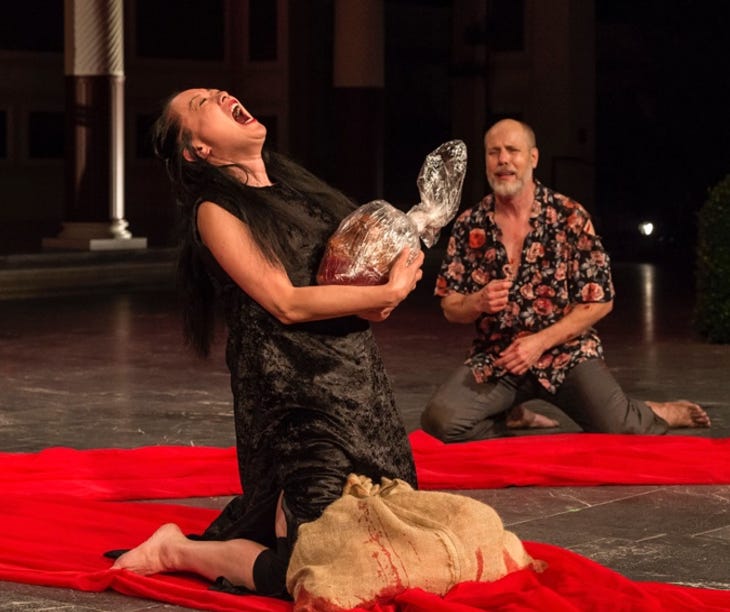 It's not a pretty story. Pentheus, the hyperrational king of Thebes refuses to believe Dionysus’s divinity. His daughter Agavê is a believer. She joins the Bacchae in their drunken festivities outside the walls of Thebes. When Pentheus in disguise is caught by the Bacchae, Agavê beheads her dad and eats his raw flesh. Kingless, Thebes is left in the hands of Dionysus, who seems less interested in governance than blind loyalty.